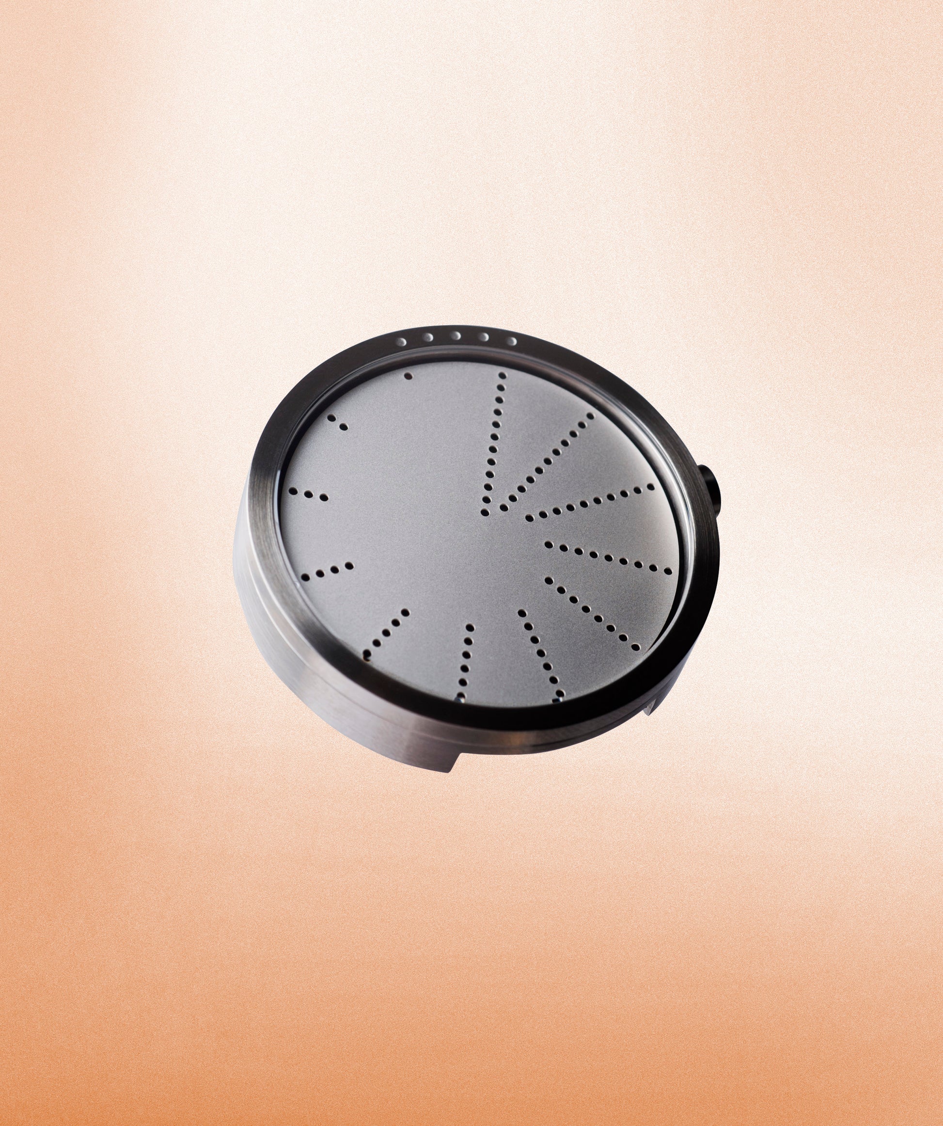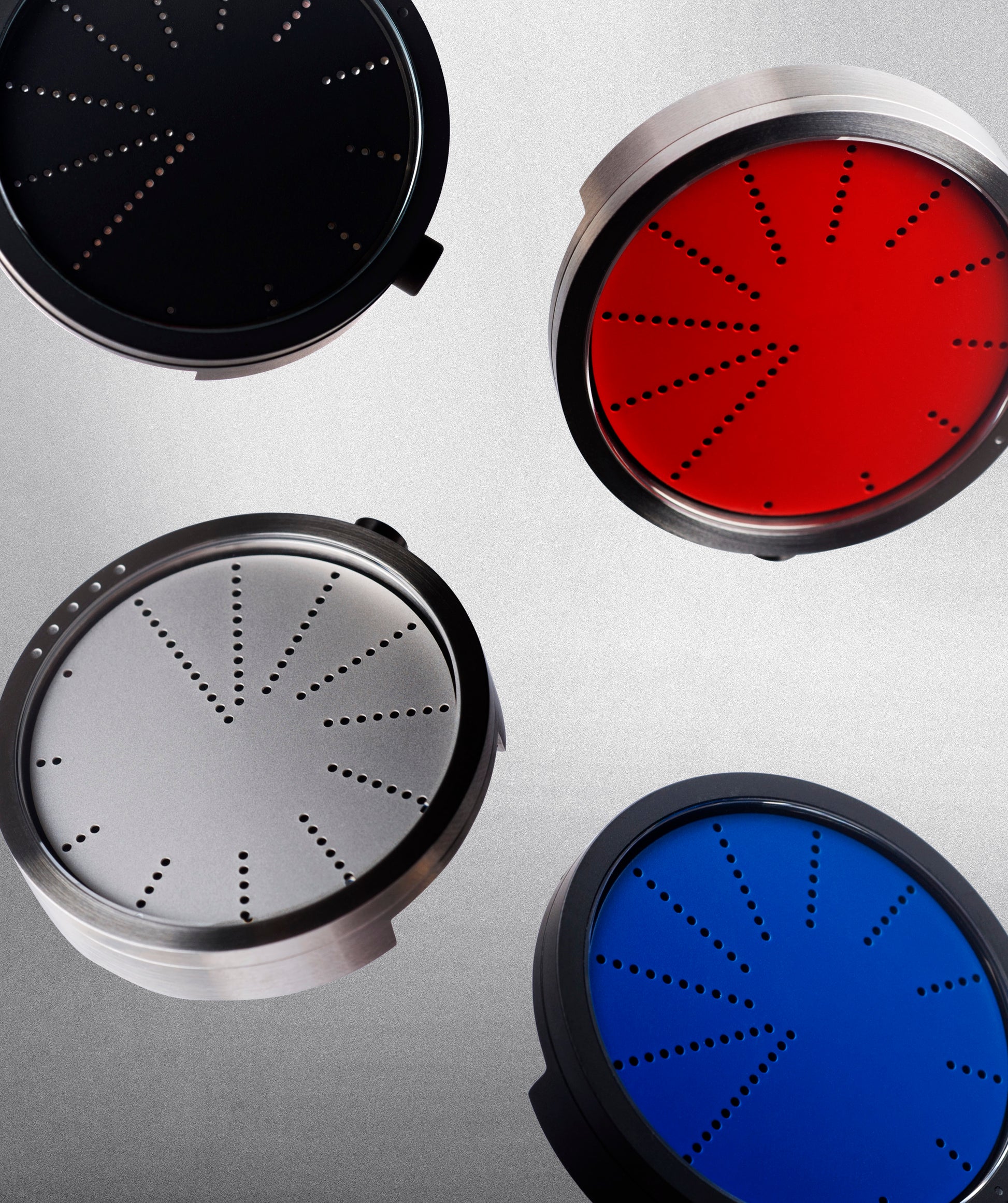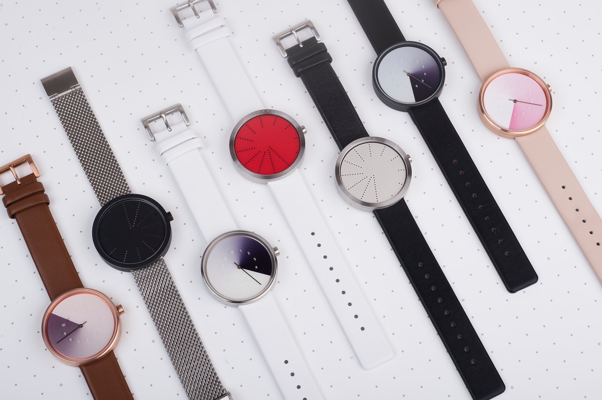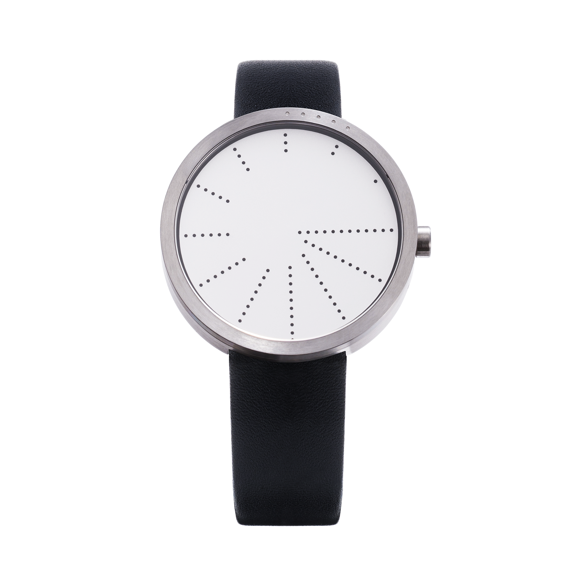 Order has no watch hands. Instead, the entire watch face is perforated with an ascending number of dots, which rotate to align with the frame and tell the time in 15 minute intervals.