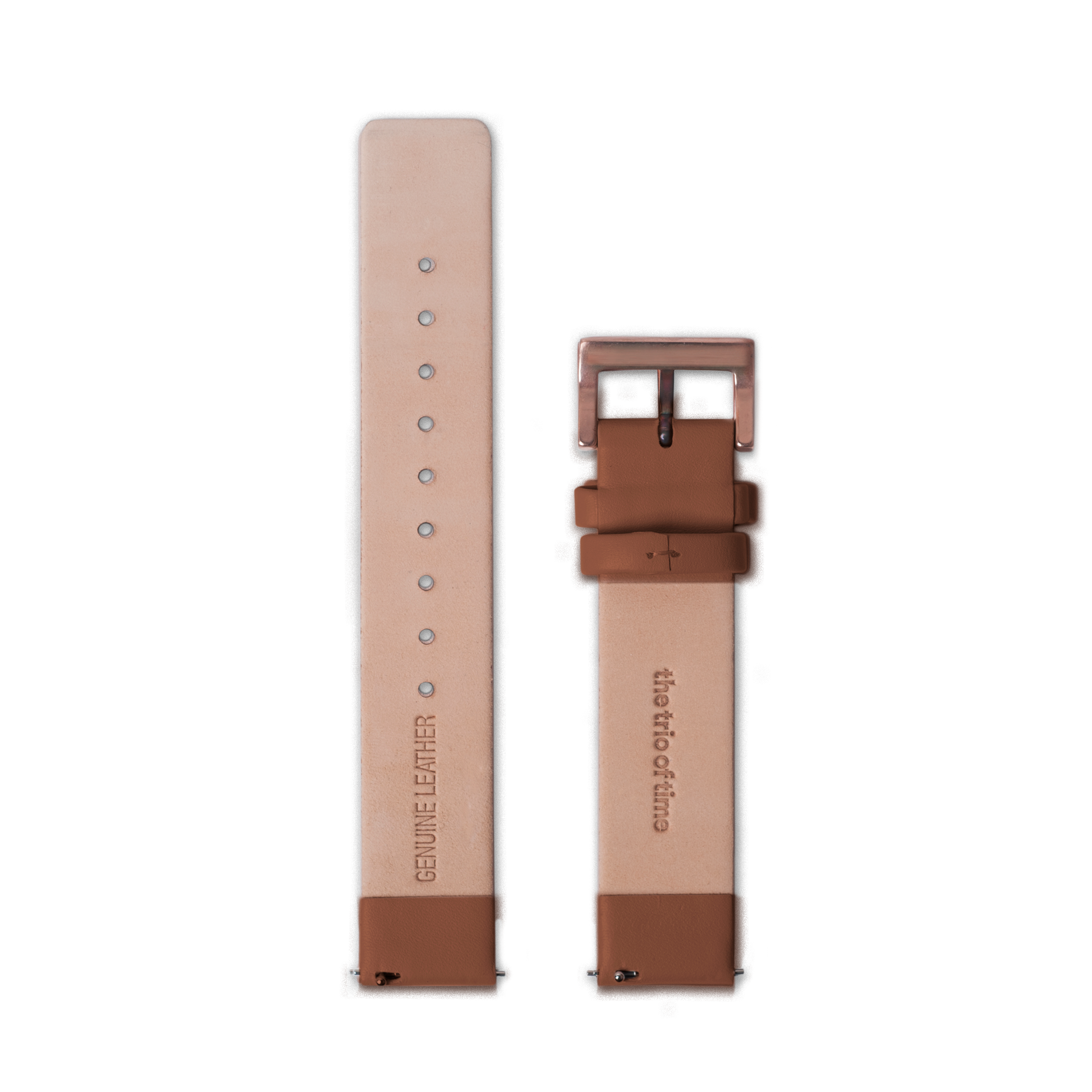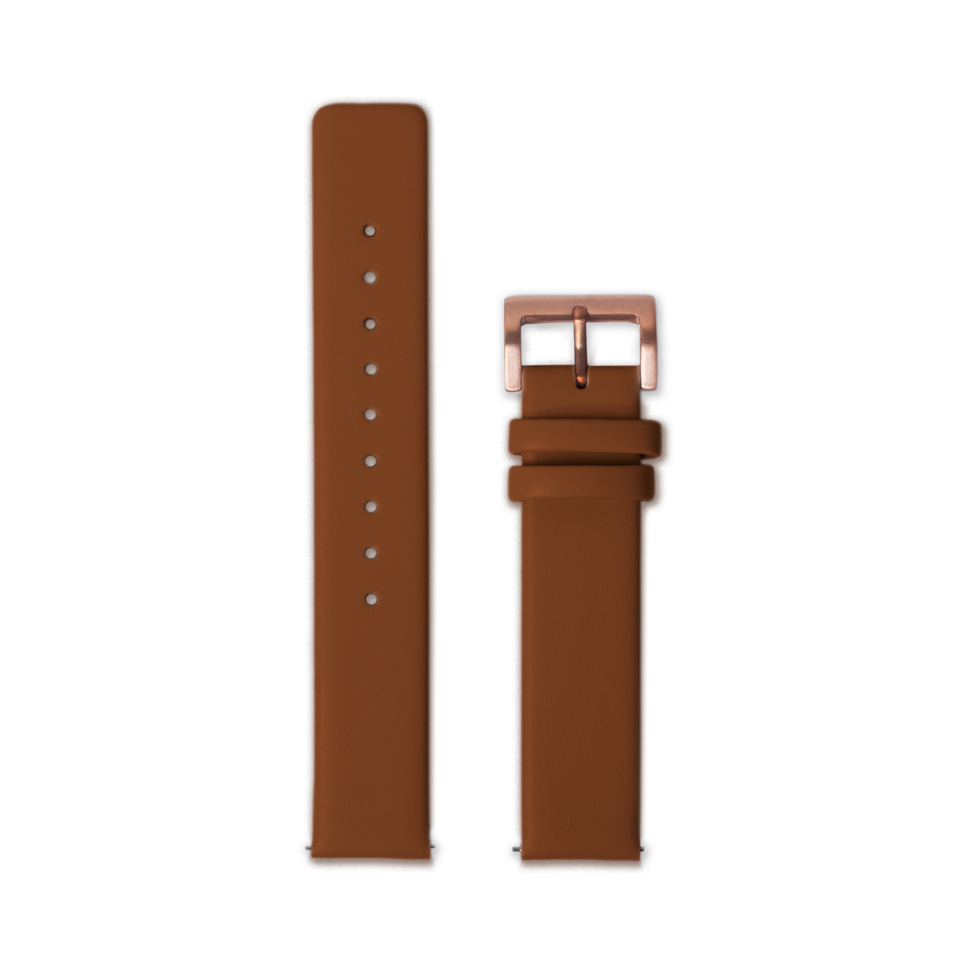Premium genuine leather, hand selected, 18mm width, with straight, wrapped construction paired with a stainless steel 18mm buckle.