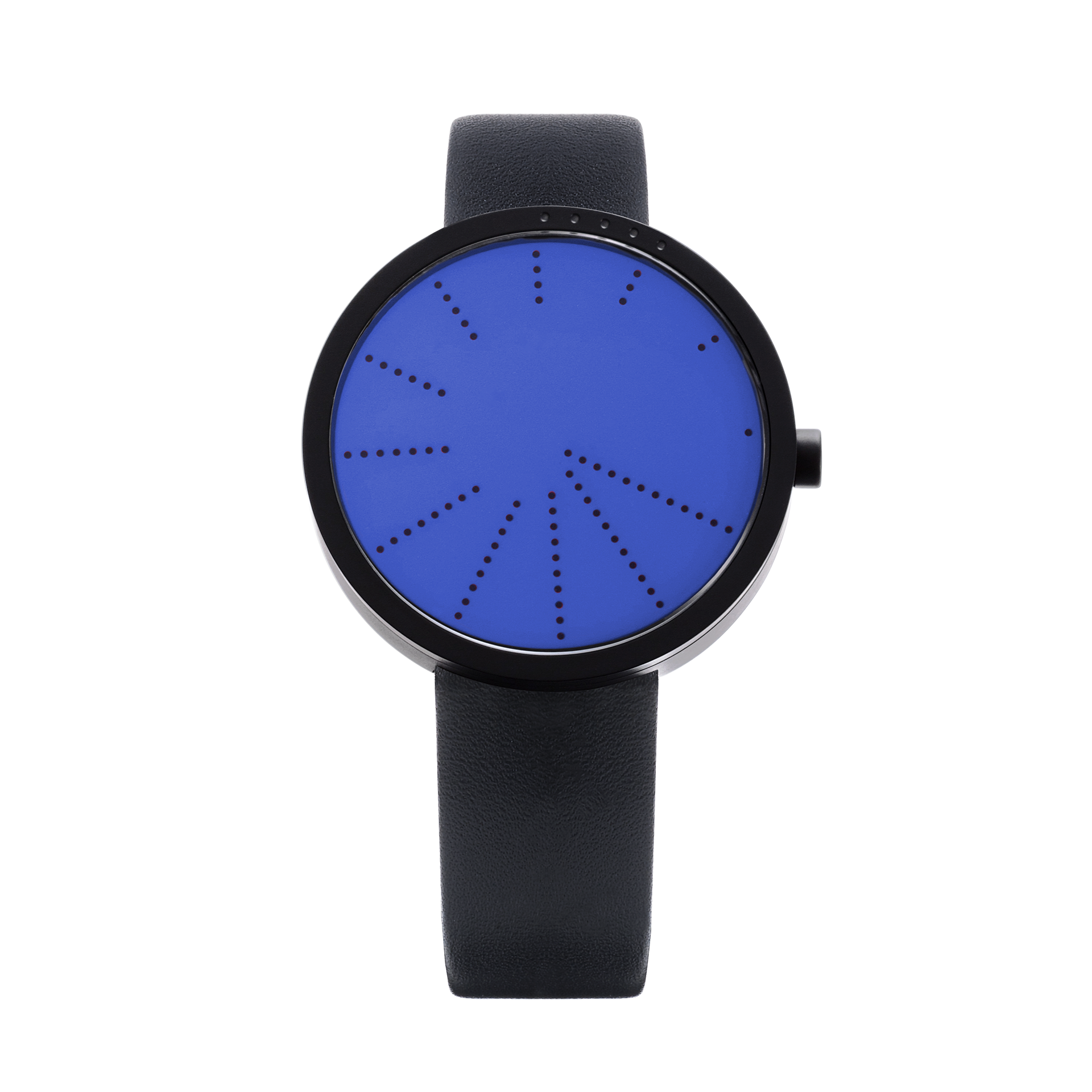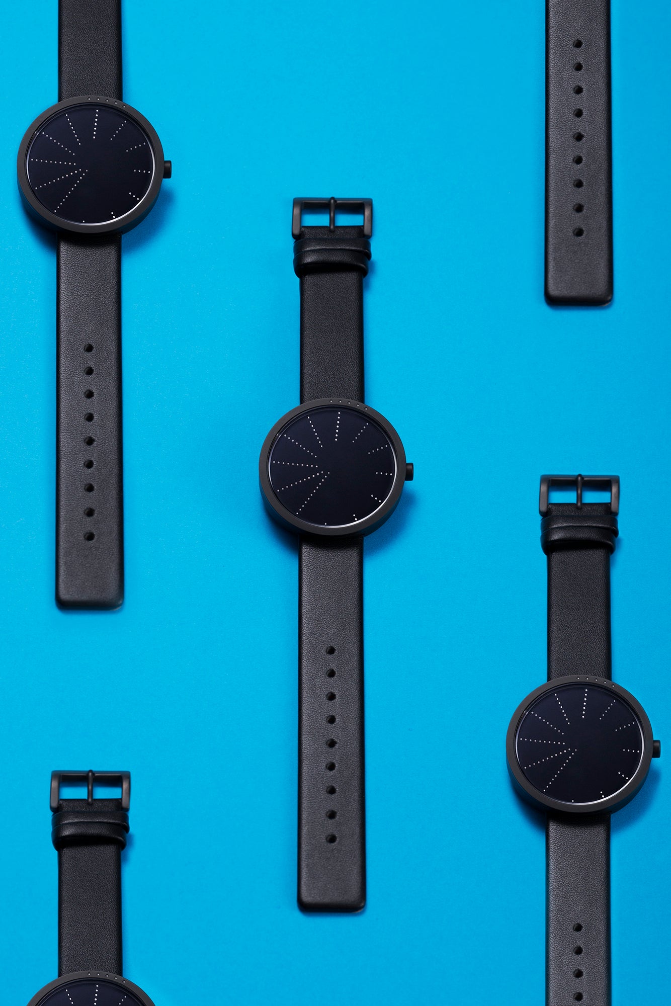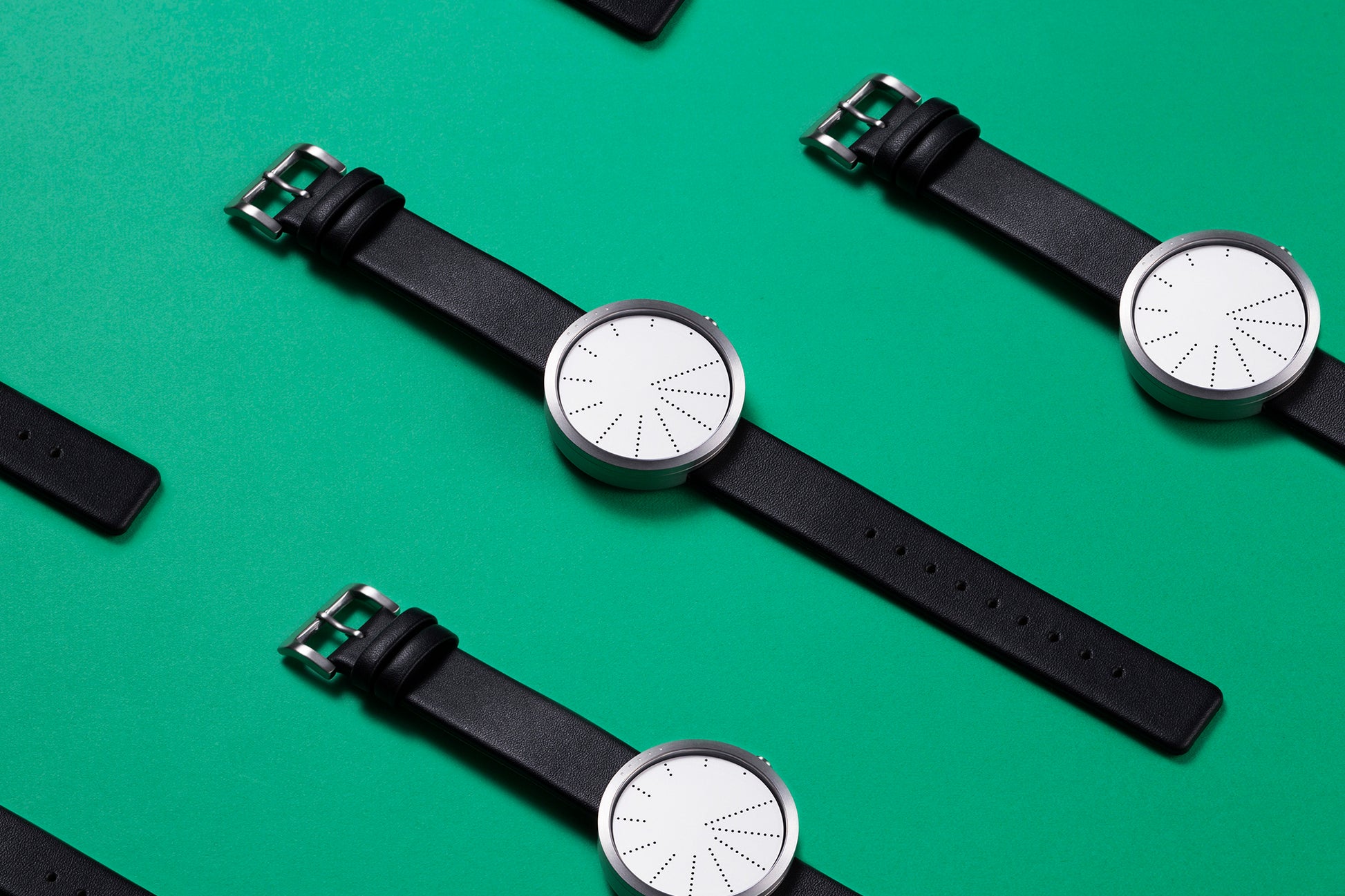 Order has no watch hands. Instead, the entire watch face is perforated with an ascending number of dots, which rotate to align with the frame and tell the time in 15 minute intervals.